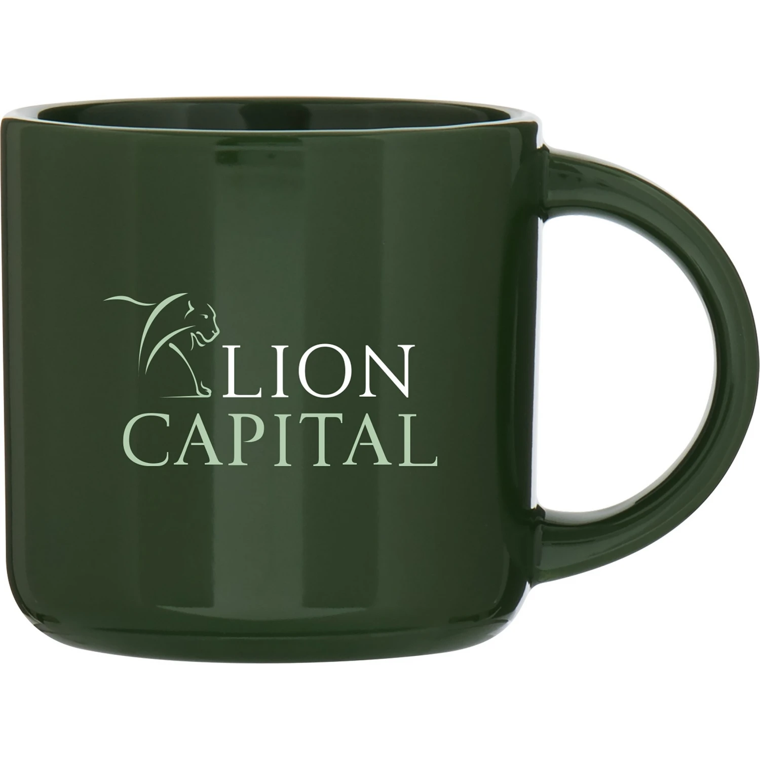 14 oz ceramic mug with glossy colored exterior and glossy colored interior. Hand wash recommended. Do not microwave with metallic imprint (glitz). Complies with FDA, Prop 65. 3.6″ H x 5″ W