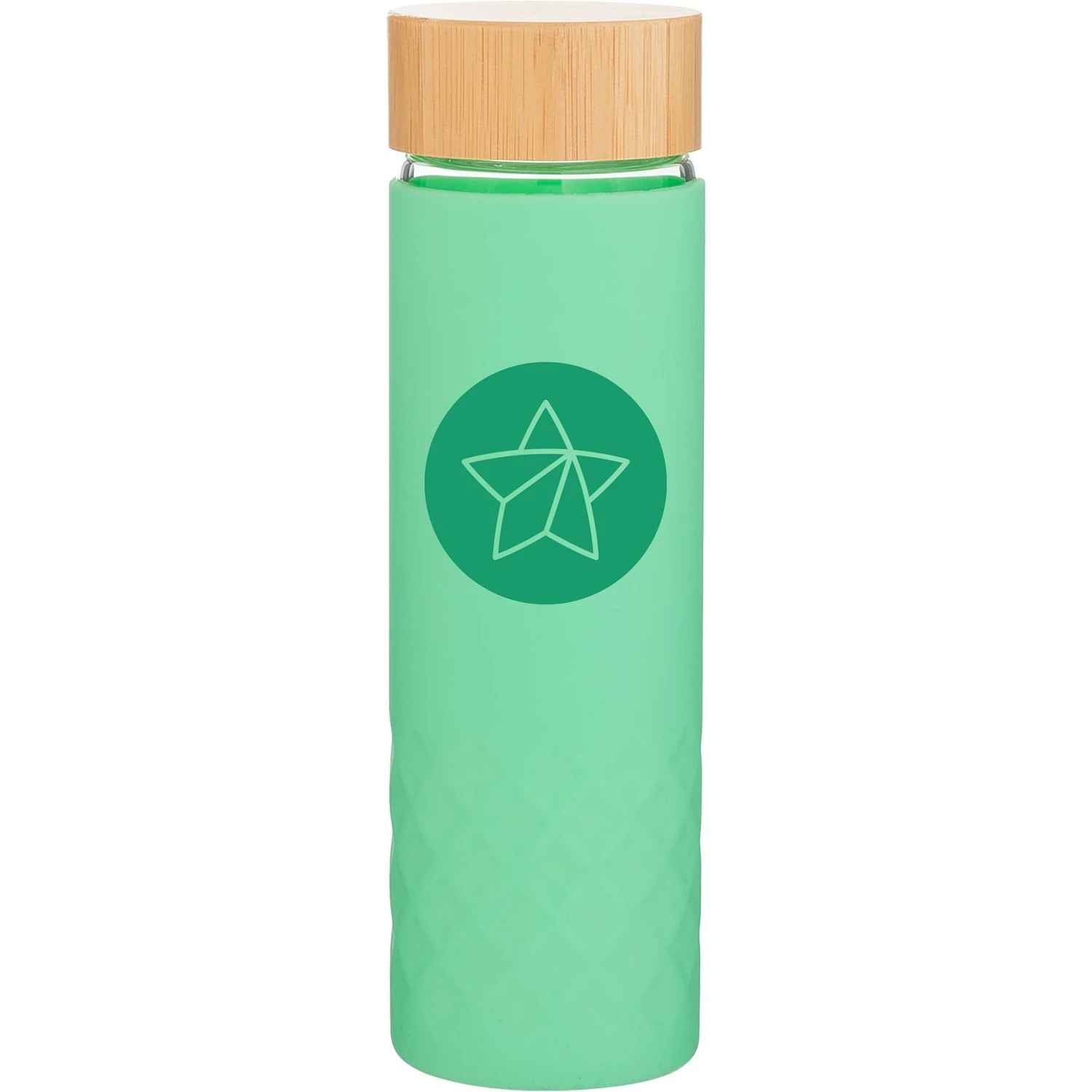 18 oz single wall borosilicate glass bottle with threaded bamboo lid, and protective silicone sleeve. Individual gift box. Hand wash recommended. Do not microwave. Complies with FDA, Prop 65. 8.8″ H x 2.7″ W