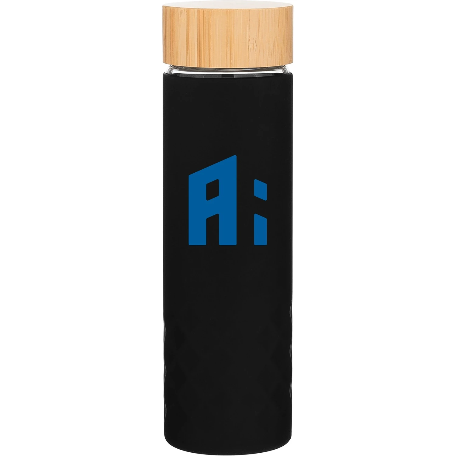 18 oz single wall borosilicate glass bottle with threaded bamboo lid, and protective silicone sleeve. Individual gift box. Hand wash recommended. Do not microwave. Complies with FDA, Prop 65. 8.8″ H x 2.7″ W