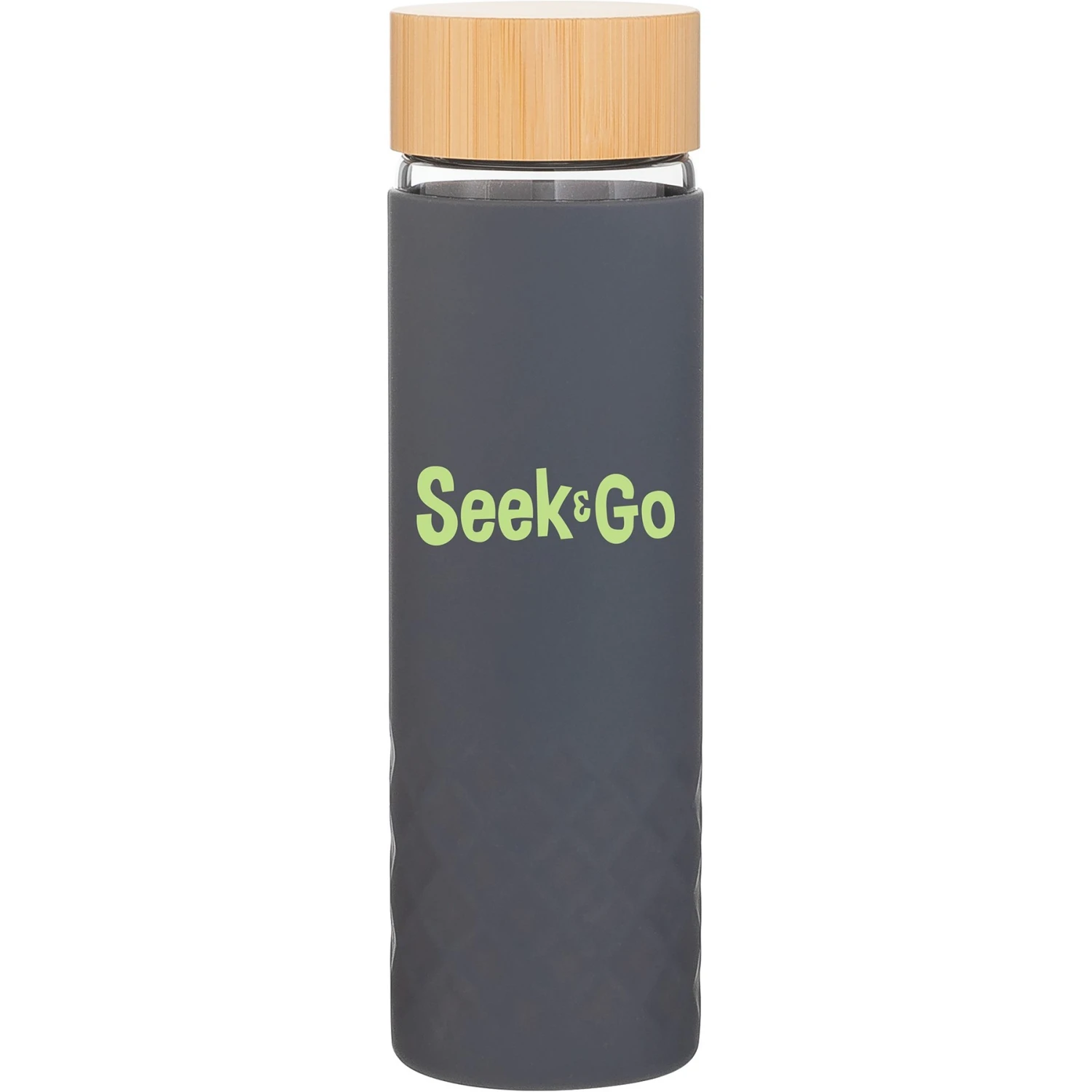 18 oz single wall borosilicate glass bottle with threaded bamboo lid, and protective silicone sleeve. Individual gift box. Hand wash recommended. Do not microwave. Complies with FDA, Prop 65. 8.8″ H x 2.7″ W
