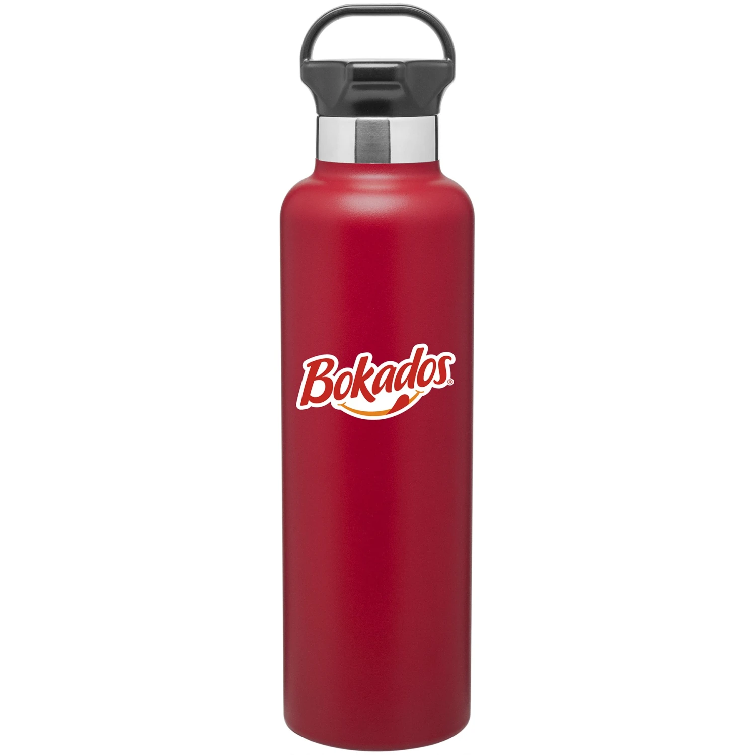 24 oz double wall 18/8 stainless steel thermal bottle with copper vacuum insulation, threaded gear-shaped insulated lid, carrying handle, high polish rim and powder coated finish. Patent D792,215. Individual gift box. Hand wash recommended. Do not microwave. Complies with FDA, Prop 65. 11.25″ H x 3″ W